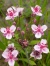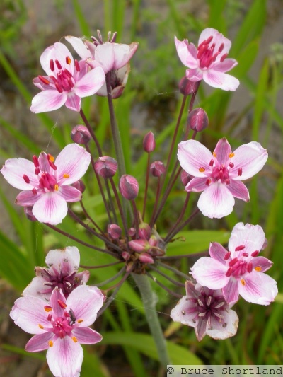Tall and rush-like, this plant has long, thin leaves and can form stands. It displays a clustered flower head with cup-shaped flowers; these have three pale pink petals interspersed with three dark pink sepals.