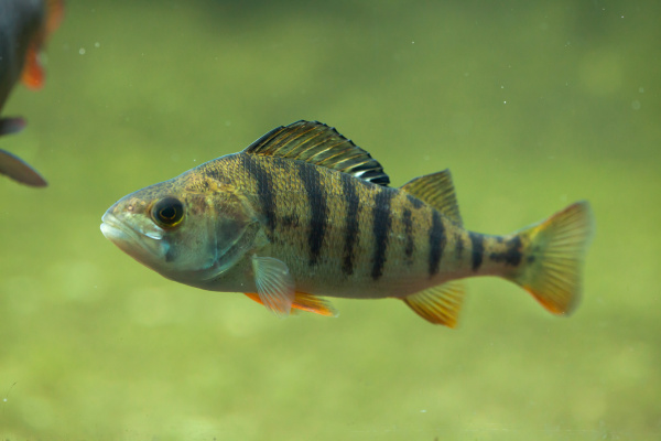 A familiar sight in lowland waterbodies and waterways across the UK, like the Montgomery Canal, the Perch is a beautiful fish. Greenish in colour, it has striking tiger-like stripes, red-orange fins and a characteristic humped back.